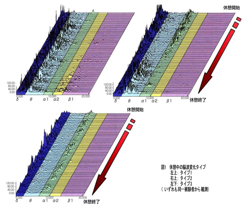 (1)休憩中の脳波の推移については,θ(4-7Hz)・α2(11-13Hz)・β1(14-20Hz)帯域の変化の違いが,休憩後の課題成績に影響していることが分かったため,これらの帯域に着目したところ,以下の3タイプ(図1)に分類できた。