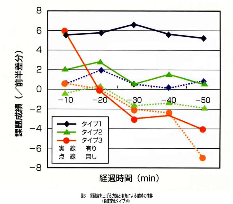 (2) 上記タイプと休憩後の課題成績との関係を分析したところ,タイプ3のみ課題時間の推移に従って成績が低下した。また,タイプ3に比べ,タイプ1の方が有意に成績が良かった(図2)。 (3) 脳波変化タイプ別に,覚醒度を上げる方策の有無と休憩後の課題成績推移との関係を分析したところ,タイプ1のみ,方策有り群の方が休憩後の課題時間を通して成績が良かった(図3)。 上記の結果から,効果的な休憩とは,休憩開始後早々に覚醒度が低下し,睡眠第2段階に至る程度の睡眠が得られるものであること,そして,その効果は覚醒度を上げる方策によって助長されることが分かった。 [関連報告書]