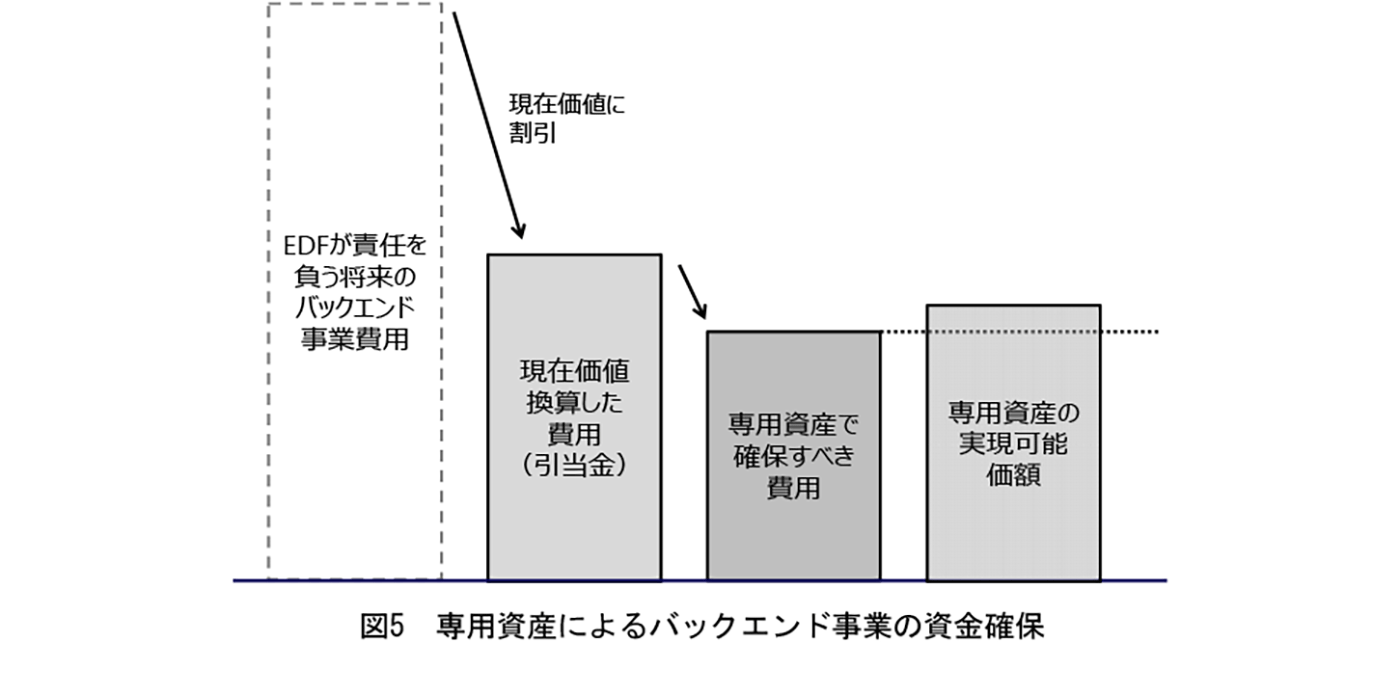図5は、専用資産でバックエンド事業の資金を確保するイメージである。すなわち、EDFは、(1)将来のバックエンド事業の費用を見積り、(2)割引率を用いて、それを現在価値に換算して引当金(Provision)とし、(3)そのうち専用資産で確保すべき費用項目の合計額に対し、(4)その金額以上の実現可能価額(realizable value)を有する専用資産を確保することになっている。