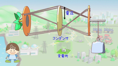 また、大きな電気を遠くまで送る時には電圧が下がってしまうので、変電所でコンデンサを入れて電圧を調整しています。